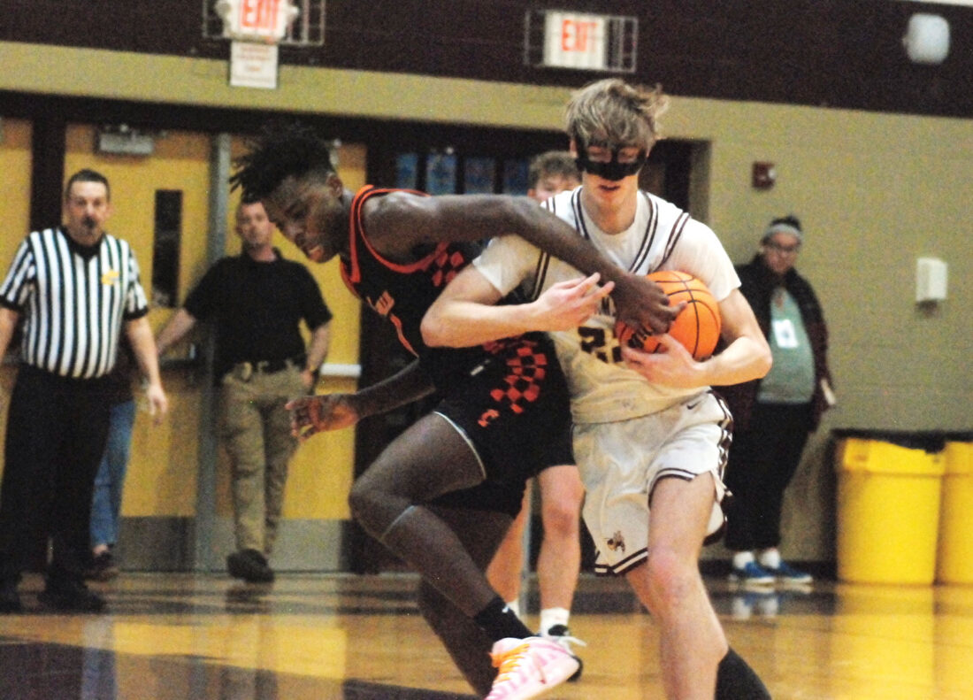 Williamstown’s Nate Frye will get prepared to go the ball inside whereas being guarded by Chapmanville’s Dakota Dalton throughout the Tigers’ 70-58 victory Friday night time. (Photo by Jay W. Bennett)