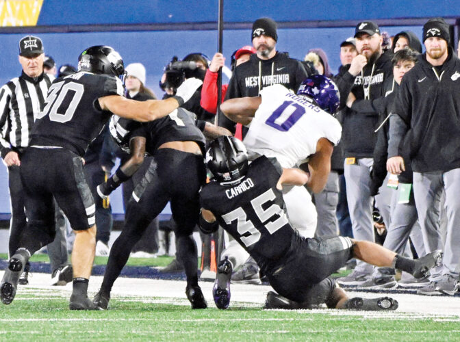 WVU linebacker Reid Carrico (35) brings down a TCU ballcarrier throughout final Saturday’s sport in Morgantown. (Photo by David Pennock)